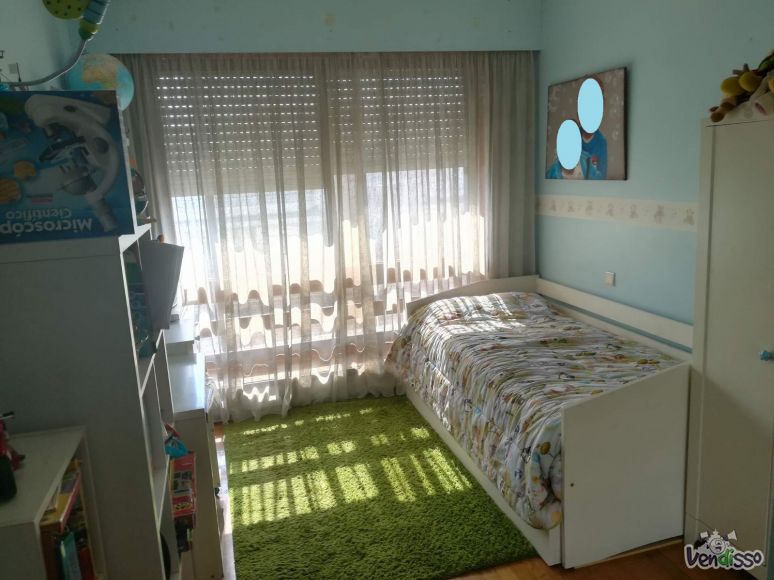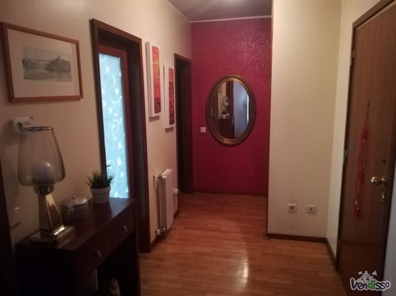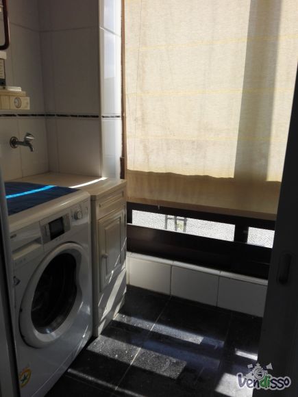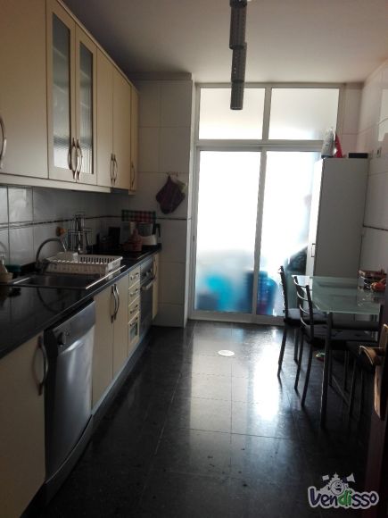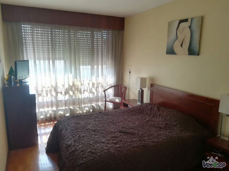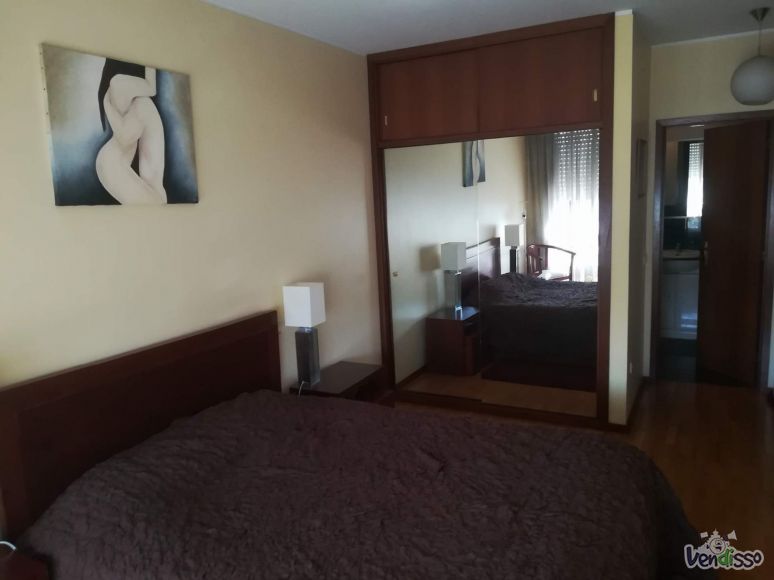 Dispões de dois quartos com roupeiros embutidos, sendo um deles suite, uma casa de banho serviço com poliban, hall de entrada com roupeiro, cozinha, lavandaria fechada, sala comum com boa dimensão e com acesso a varanda, e um lugar de garagem com arrumo fechado. O imóvel está equipado com gás natural, aquecimento central, caixilharia dupla, cozinha equipada (frigorífico, placa e forno), porta de segurança, vídeo porteiro, com orientação solar poente, apresenta muito boa luz natural, arrendado sem mobília.