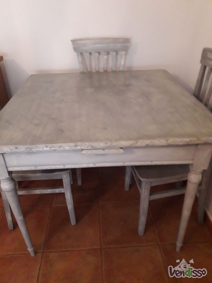 É uma mesa em madeira com abas e capacidade para até oito pessoas, acompanhada de seis cadeiras também em medeira guarnecidas com almofada, tudo em bom estado.