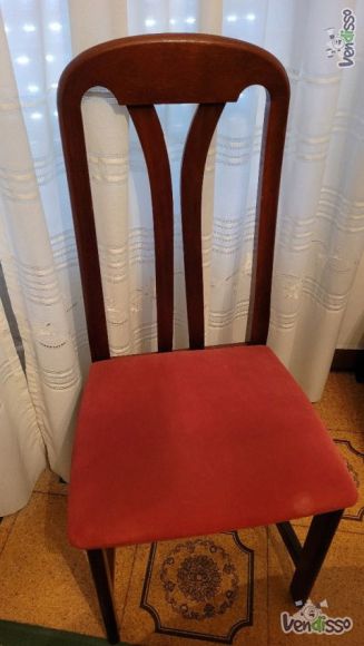 Conjunto de móvel em mogno com mesa redonda e seis cadeiras forradas a veludo.