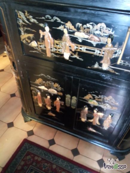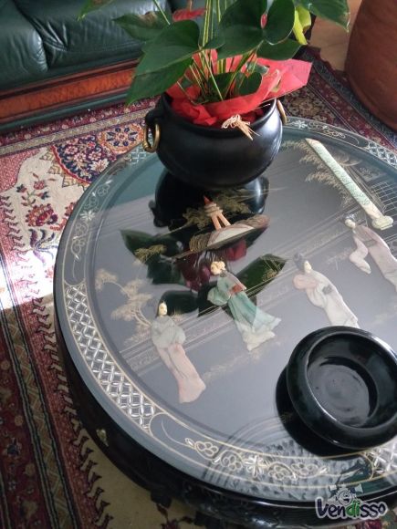 Móvel de madeira em nogueira, com espelho (novo), - móvel de entrada. Bar em pau preto com aplicação de em marfim pérola, mesa de centro igual.